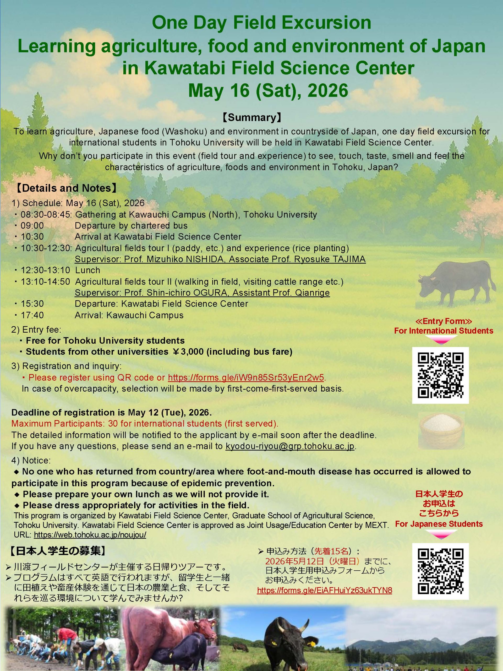 Kawatabi Field Science Center., Graduate School of Agricultural Science is organizing one day field excursion for Tohoku University's international students on 16th May, 2026. Why don't you participate in this event to learn agriculture, foods and environment in Japan?