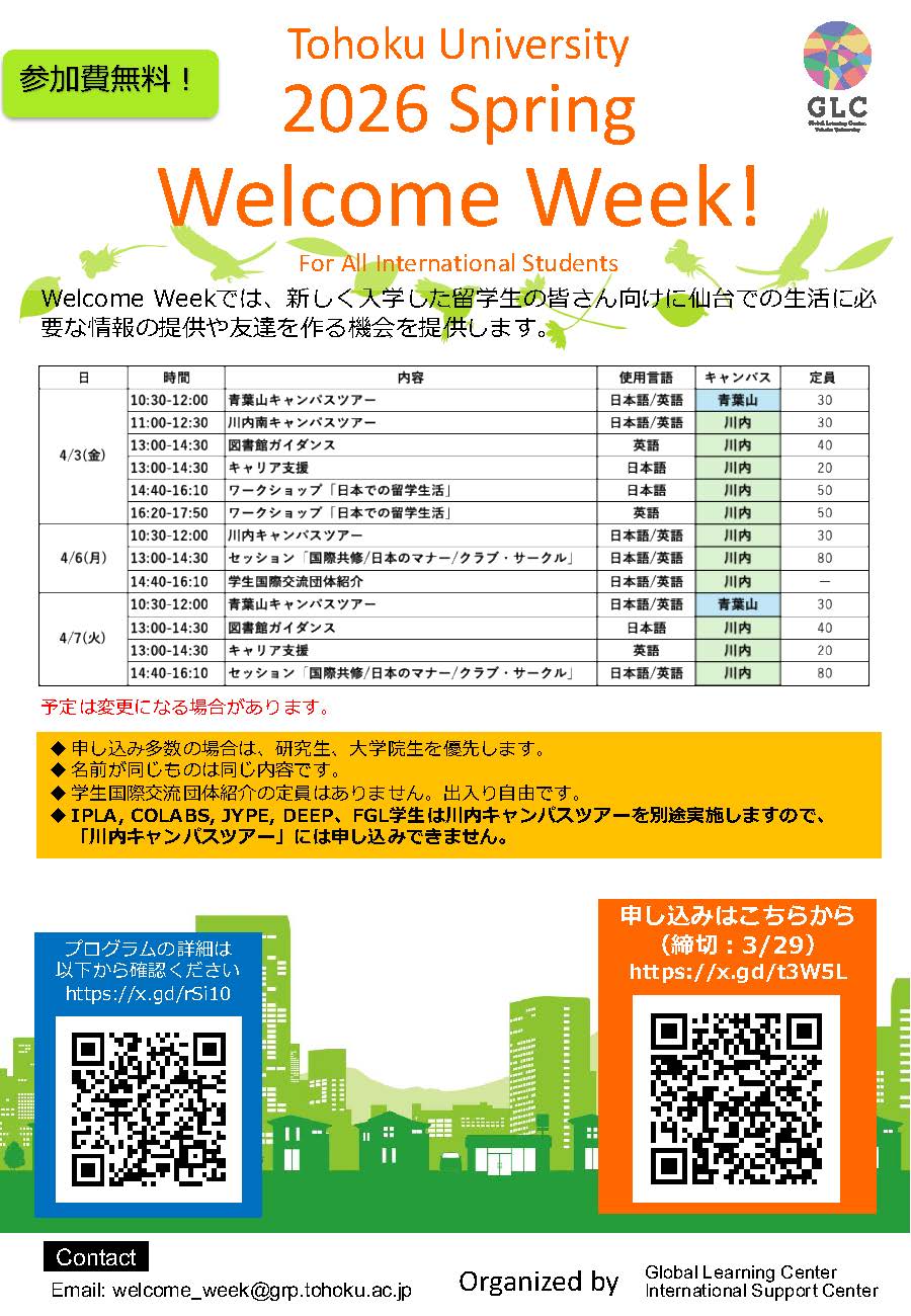 Welcome Weekでは、新しく入学した留学生の皆さん向けに、仙台での生活に必要な情報の提供や友達を作る機会を提供します。
