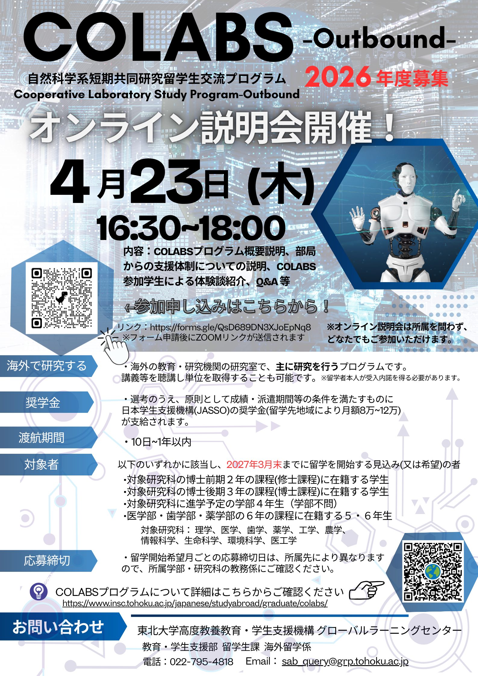 | 内容 | 海外の教育・研究機関で研究するプログラム COLABS(自然科学系短期共同研究留学生交流プログラム)の派遣留学生募集に関する説明会です。 プログラム概要説明、部局別⽀援体制紹介、参加学⽣体験談等 | |