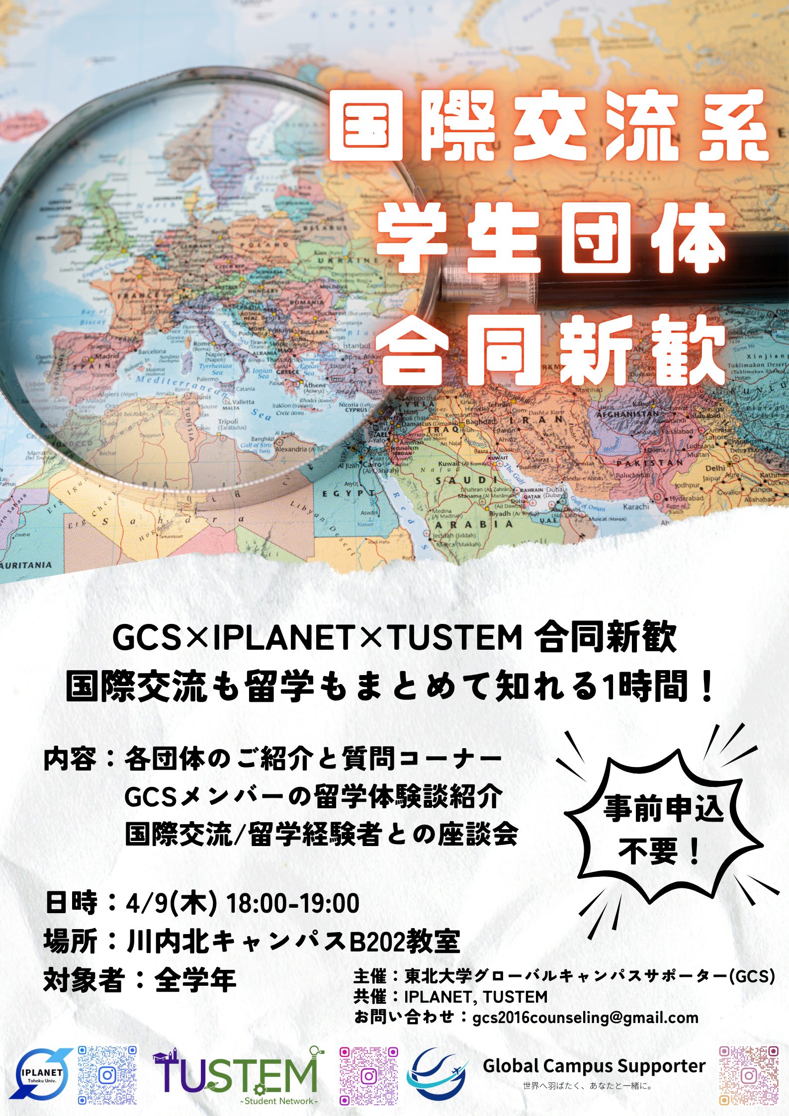 | 問合せ | 東北大学グローバルキャンパスサポーター(GCS) 又は、GCS公式LINEアカウント |