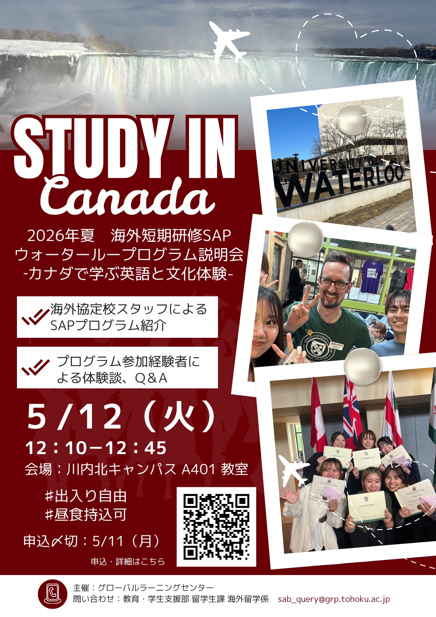 2026年夏休みにカナダ・ウォータールー大学で実施する海外短期研修(SAP)、「カナダで学ぶ英語と文化体験」プログラムに関する説明会を行います。