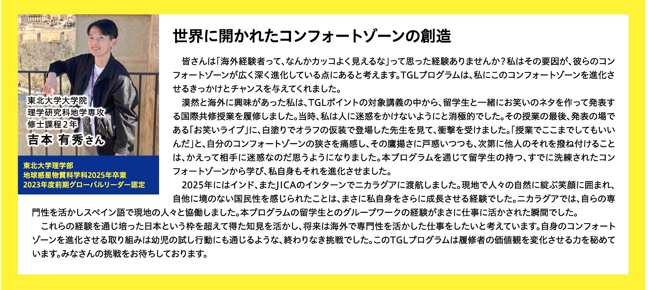世界に開かれたコンフォートゾーンの創造 吉本 有秀さん (理学部卒業・理学研究科在籍中)