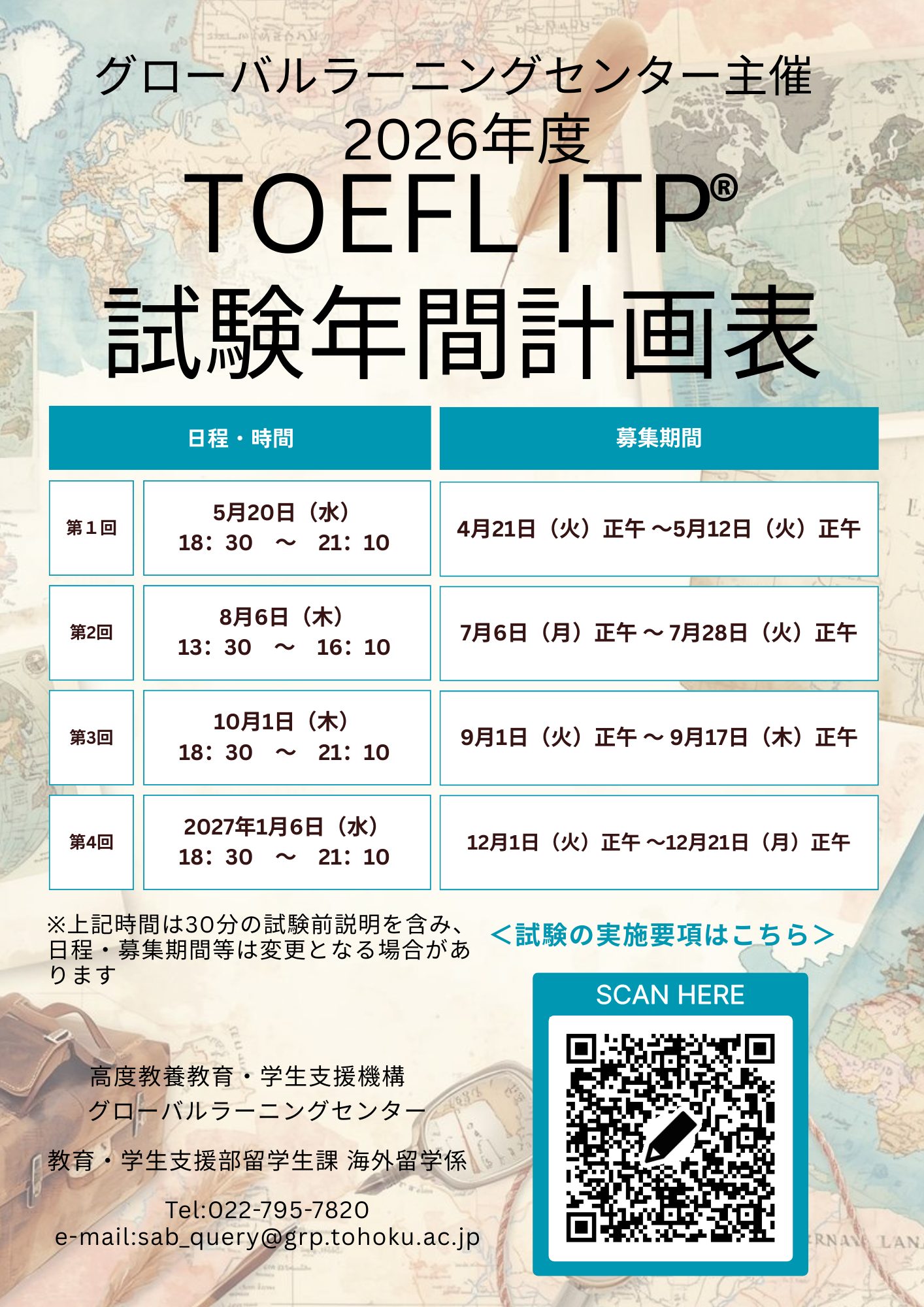 2026年度第1回グローバルラーニングセンター主催TOEFL ITP®テストを2026年5月20日(水)に実施します。