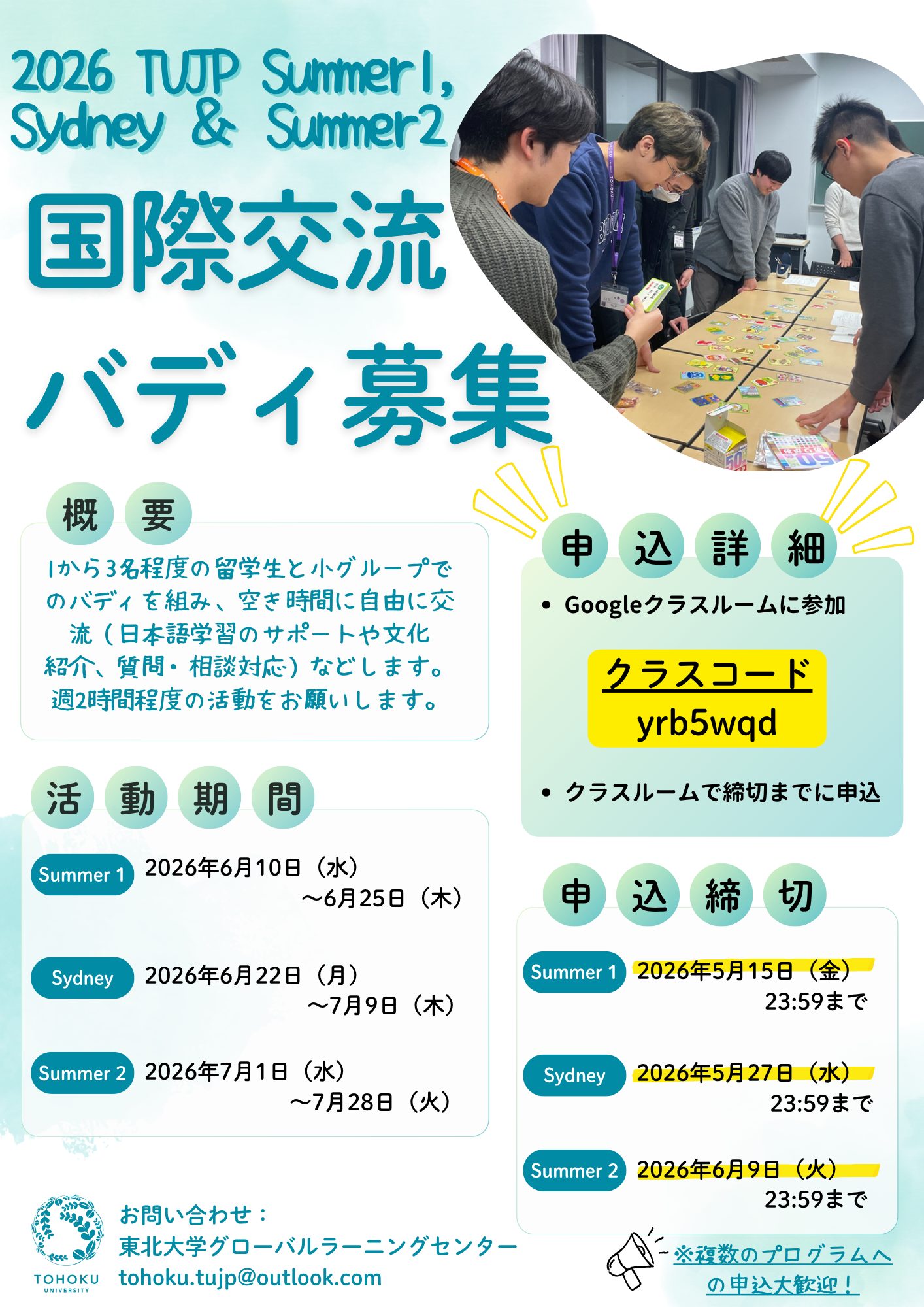 東北大学留学生受入れショートプログラム(TUJP)における、国際交流バディを以下の通り募集します。 TUJP (Tohoku University Japanese Program)は、海外の協定校等の学生を対象として実 […]