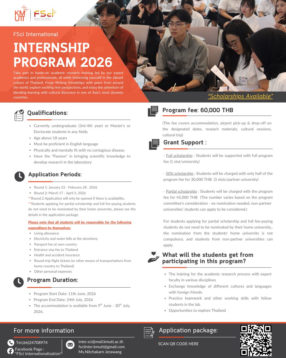 | 概要 | 【概要】タイのキングモンクット工科大学トンブリ校のFaculty of Science(FSci) が主催するインターンシッププログラムです。参加者は、ガイダンスに記載のとおり、研究室で学術研究のトレーニングを受け、インターンシップレポートの作成と、最終プレゼンテーションを行います。 【費用】授業料は無料ですが、プログラム費用(宿泊費、空港送迎料、研究で使用する備品代、小旅行の費用を含む)として60,000THBがかかります。 ただし、協定校につき、本学より推薦された学生1名は上記プログラム費用が無料、3名までは半額で参加できます。上記以外の費用は参加者の自己負担となります。 【参加条件】 ・18歳以上の学部生、大学院生 ・研究を行うに必要な英語力を保持していること ・身体的にも精神的にも健康で、伝染性の病気がないこと。 【応募書類】 学内審査に合格した場合、主催校への申請には以下の応募書類の提出が必要です。 1.1) Filled application form (FORM - 002) 1.2) A recent colored photo affixed to the top right corner of the application form (FORM - 002) 1.3) An official transcript 1.4) Copy of ID card or passport 1.5) Proof of English language efficiency (English test score or a letter certifying the students’ level of English) 1.6) A recommendation letter from advisor/lecturer or dean any format 1.7) A nomination letter from International office of home institution any format (only required for students who would like to be considered for full or 50% scholarships) ※1.7)は留学生課で準備しますが、1.6)は参加者自身で指導教員や所属部局へご依頼ください 詳細は以下のガイダンスと研究室リストをご確認下さい。 guidance laboratory list Application Form(FORM-002) |