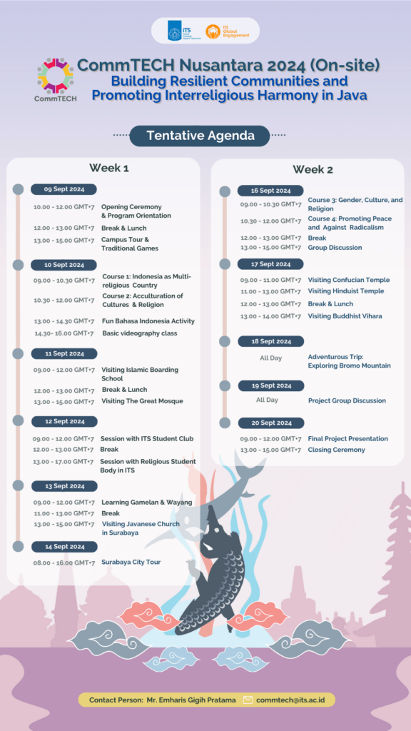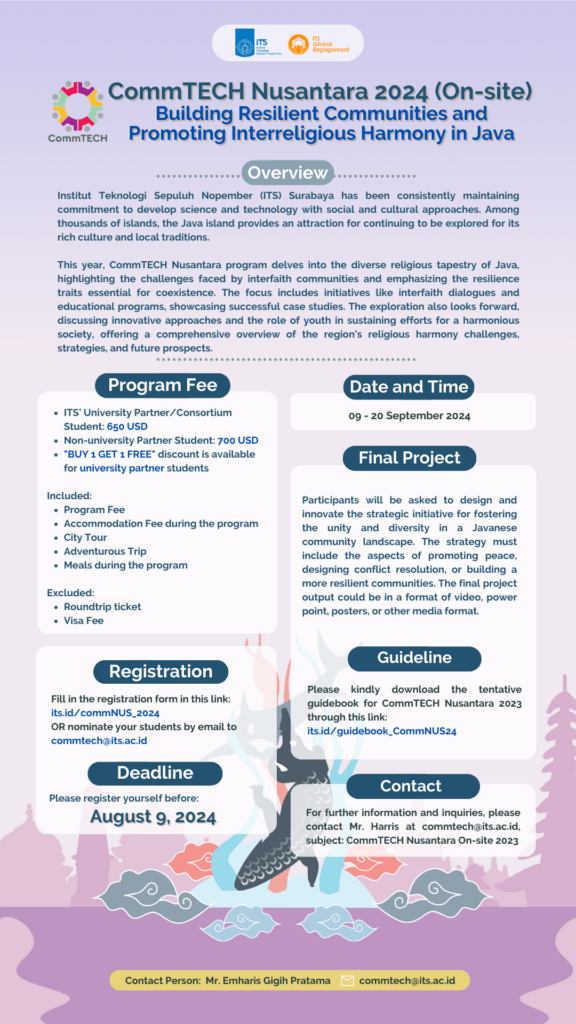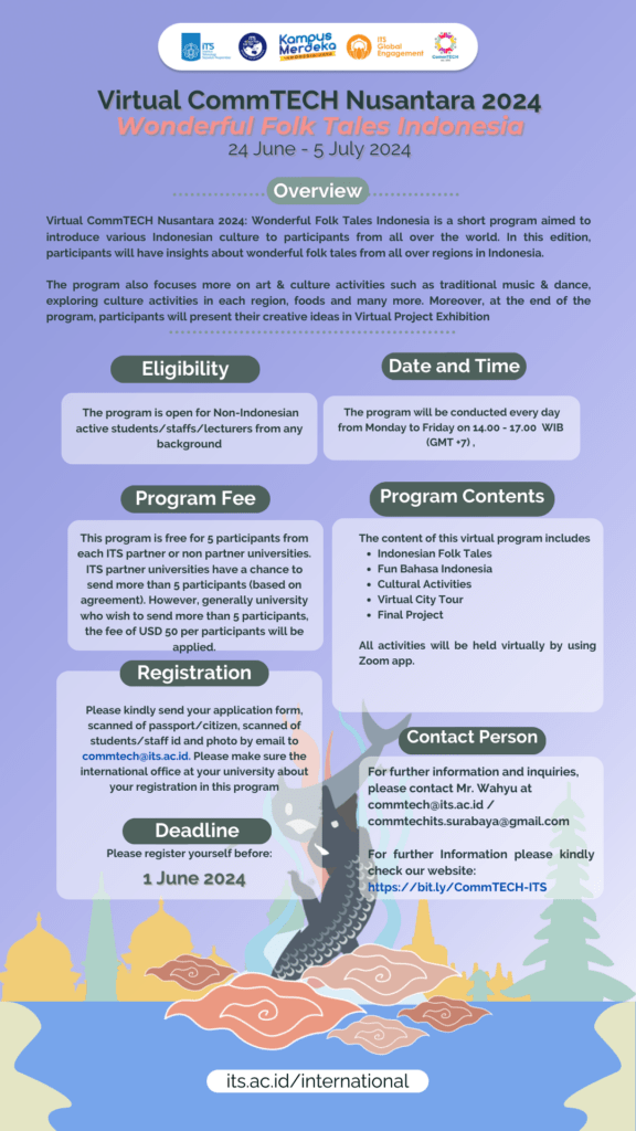 | 概要 | 【概要】インドネシアのセプル・ノーペンバー工科大学(ITS)が主催する、ITSとインドネシアの技術や文化に関する様々なトピックを紹介することを目的とした短期オンラインプログラムです。今回は、ITSの学生が紹介するキャンパスでのイノベーションや学生活動についても紹介されます。また、伝統音楽、ダンス、料理など、様々な芸術・文化活動についてのトピックも盛り込まれています。プログラムの最後には、参加者はバーチャルプロジェクトエキシビジョンで独創的なアイデアを発表します。 【日程】全10クラス 月~金 18:30 – 21:30 GMT +7 (日本時間:20:30~23:30) 【対象】インドネシア国籍以外の学部、修士課程、および博士課程の学生(学部不問) 【参加費】無料 コースの詳細は以下ウェブサイトとポスターよりご確認ください。 Virtual CommTECH Exploration 2026:ウェブサイト ※期間中の全ての授業に参加することが無料参加の条件となりますのでご留意ください |